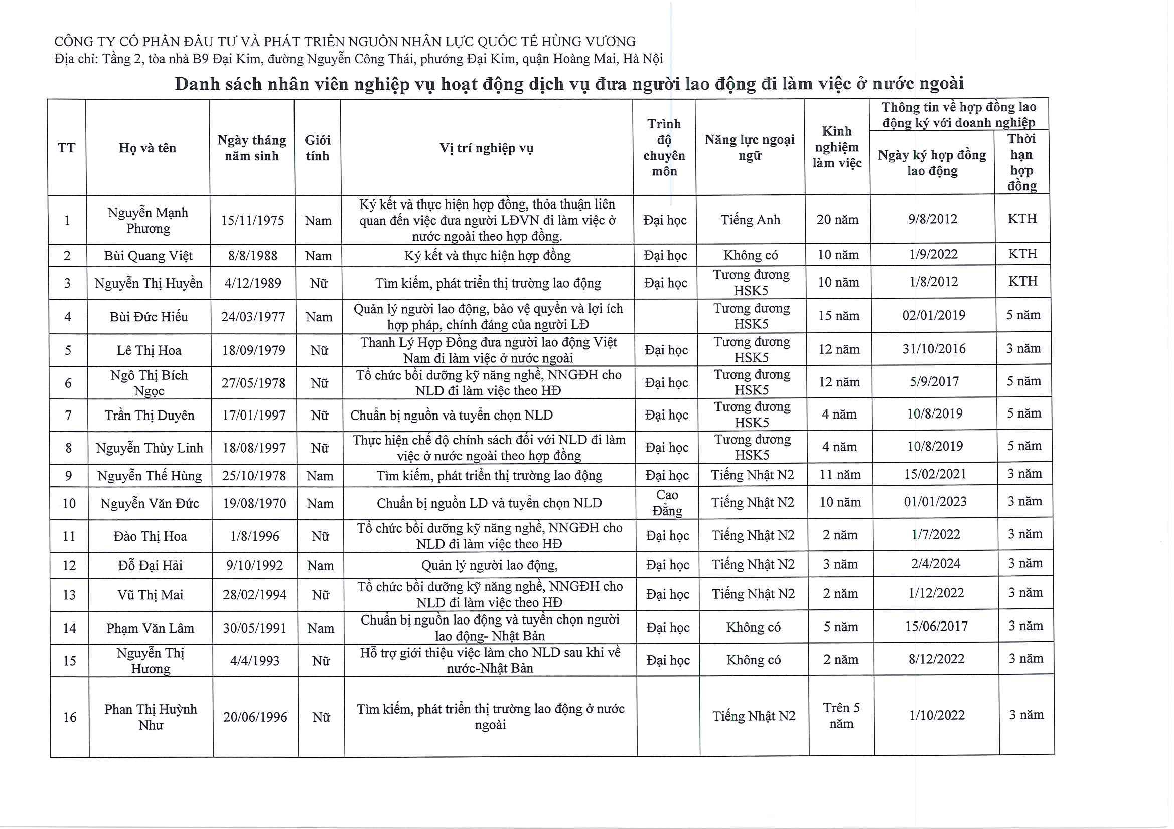 DANH SÁCH NHÂN VIÊN NGHIỆP VỤ THỰC HIỆN HOẠT ĐỘNG DỊCH VỤ ĐƯA NGƯỜI LAO ĐỘNG