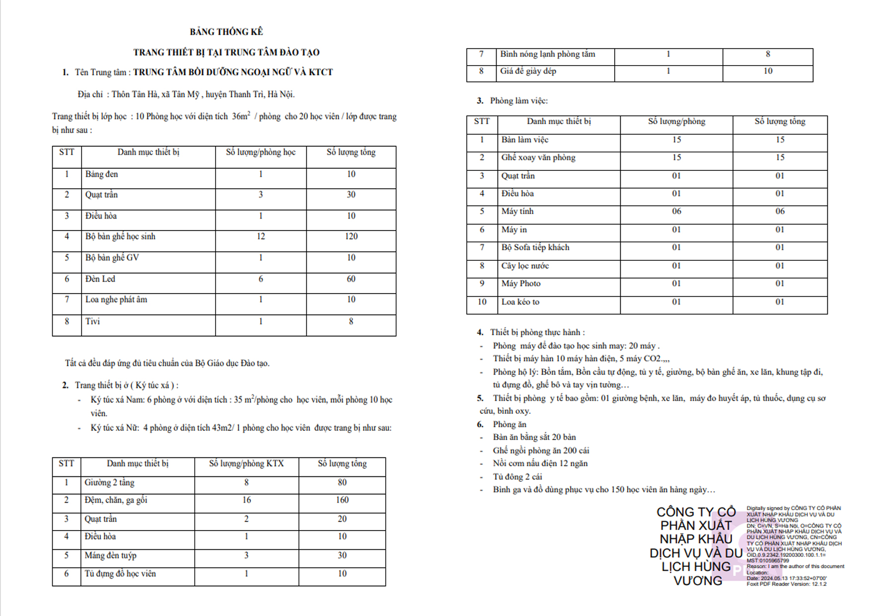 3. BẢNG THỐNG KÊ THIẾT BỊ CƠ SỞ VẬT CHẤT TRUNG TÂM ĐÀO TẠO