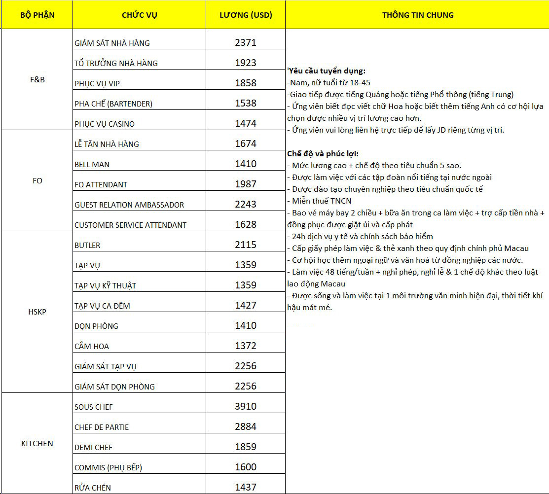 HAVIMEC là Công ty xuất khẩu lao động sang thị trường Macao chuyên về lĩnh vực nhà hàng, khách sạn. Khách hàng của chúng tôi kinh doanh về lĩnh vực khách sạn, khu nghỉ mát cao cấp tại Macau. Hiện tại chúng tôi đang cần tuyển các vị trí sau: